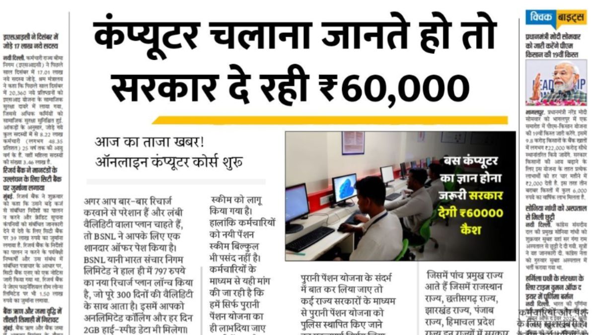 Computer Course 2026 – तकनीकी दौर में जहां हर काम डिजिटल हो चुका है, वहीं लाखों पढ़े-लिखे युवा कंप्यूटर की जानकारी न होने की वजह से रोजगार की दौड़ में पिछड़ते जा रहे हैं। इसी चुनौती से निपटने के लिए केंद्र सरकार ने ऑनलाइन कंप्यूटर प्रशिक्षण योजना 2026 की शुरुआत की है। खास बात यह है कि इस योजना में प्रशिक्षण बिल्कुल मुफ्त है और साथ में ₹60,000 तक की आर्थिक मदद भी दी जाएगी।